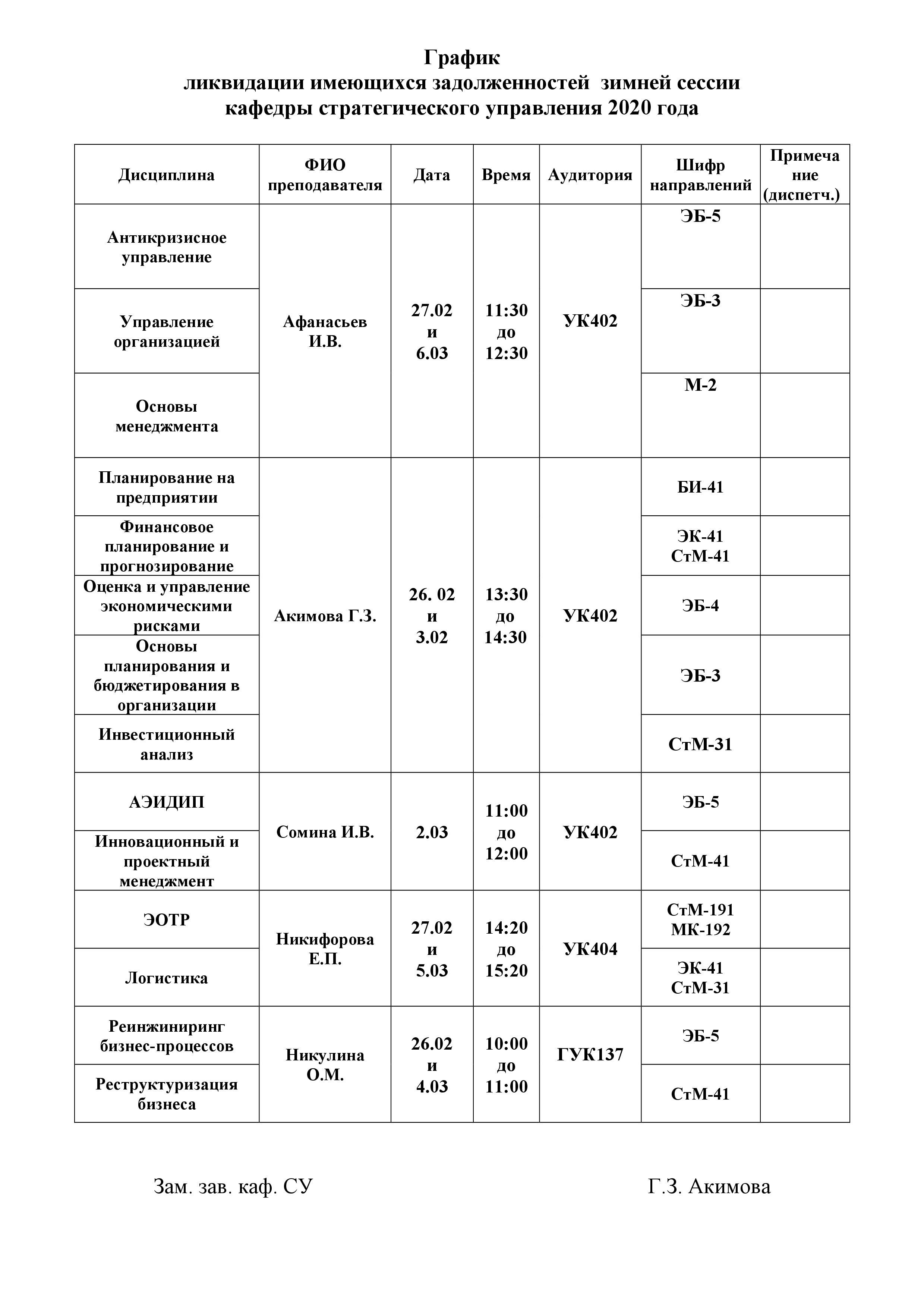 На кафедре стратегического управления с 25.02.2020 по 07.03.2020 будет проходить прием задолженностей за зимнюю экзаменационную сессию преподавателями кафедры согласно графику.